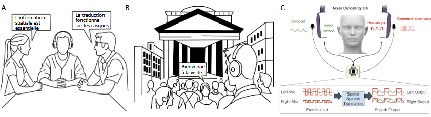 Renderização binaural: Depois de traduzir, o sistema reproduz o áudio pelos fones de ouvido, usando pistas espaciais para fazer com que a voz traduzida pareça estar vindo da direção original. Um modelo de IA foi treinado para separar e extrair as fontes de fala, se presentes, ou reportar como silêncio se não houver fala em determinado ângulo do espaço.