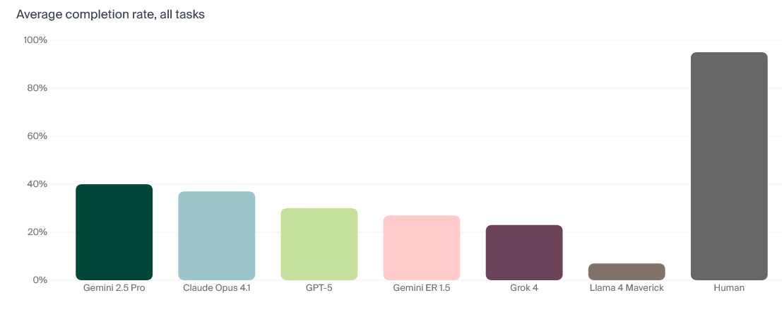 O LLM de melhor desempenho, o Gemini 2.5 Pro do Google, foi bem sucedido em apenas 40% das vezes. Outros modelos o seguiram de perto: Claude Opus 4.1, GPT-5, Gemini ER 1.5 e Grok 4. O Lama 4 Maverick do Meta ficou bem atrás.
