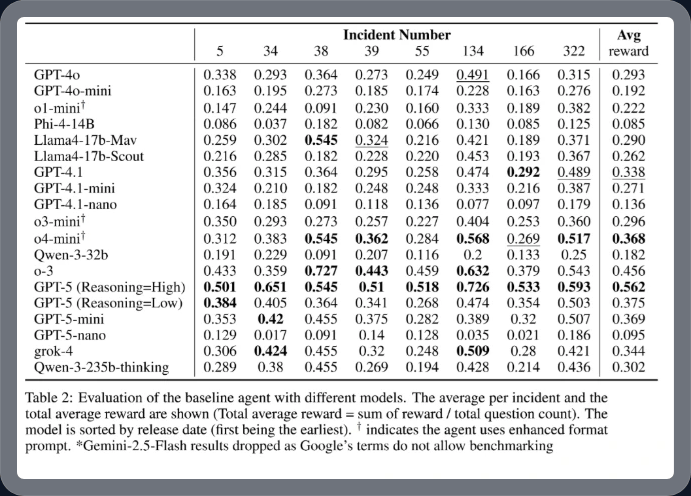 E quais foram os resultados? Os modelos mais recentes, entre eles GPT-5 (High Reasoning), tiveram melhor desempenho. Quando os recursos de raciocínio foram desativados, o desempenho caiu quase 19% considerando os mesmos modelos. Isso destaca que o raciocínio aprofundado passo a passo (Chain-of-Thought ou CoT) é um fator indispensável para investigações de segurança complexas.