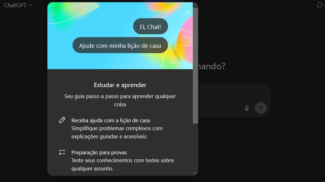 O ChatGPT lançou um modo de estudo como nova experiência de aprendizado que ajuda a desenvolver uma compreensão mais aprofundada sobre qualquer tópico. Ao ativá-lo, o ChatGPT fará perguntas para entender seus objetivos e nível de entendimento e, em seguida, trabalhará com você para alcançar as respostas em conjunto. Veja como fazer abaixo: