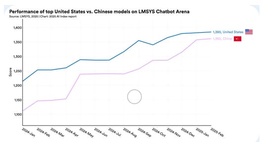 Os EUA ainda lideram com os melhores modelos de IA, mas a China está se aproximando.