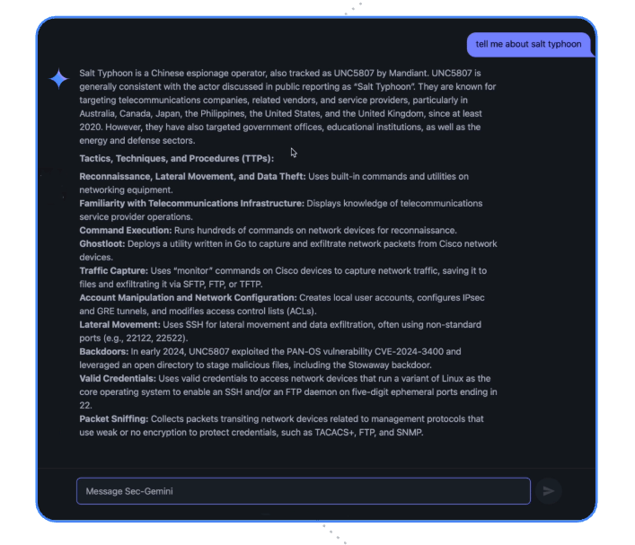 O Sec-Gemini v1 combina a capacidade do Gemini com conhecimento e ferramentas de segurança cibernética quase em tempo real.