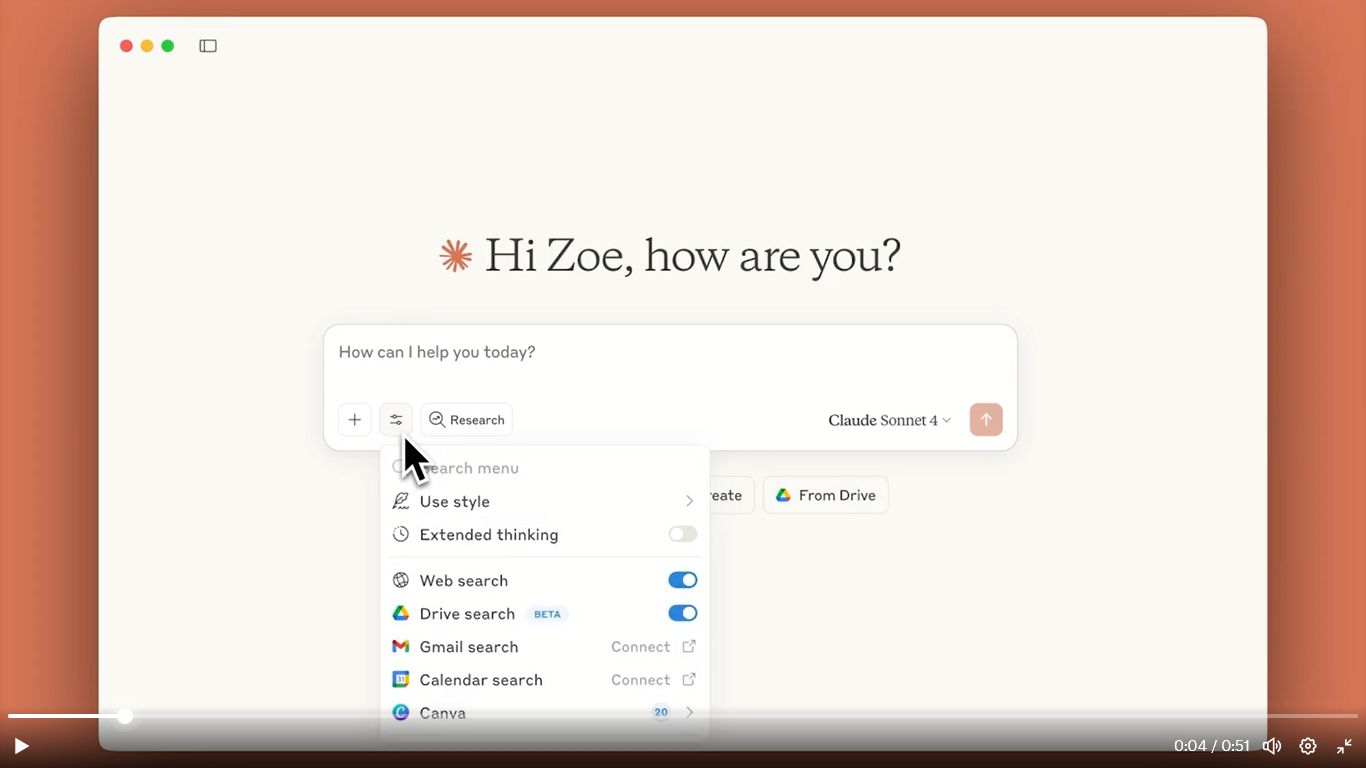 Voilà! O Claude mostrará algumas opções para você escolher a que mais lhe agradar. E ainda apresentará conectores para diversas ferramentas para que continue trabalhando, por exemplo, com Gmail, Drive ou Canvas, entre várias outras.